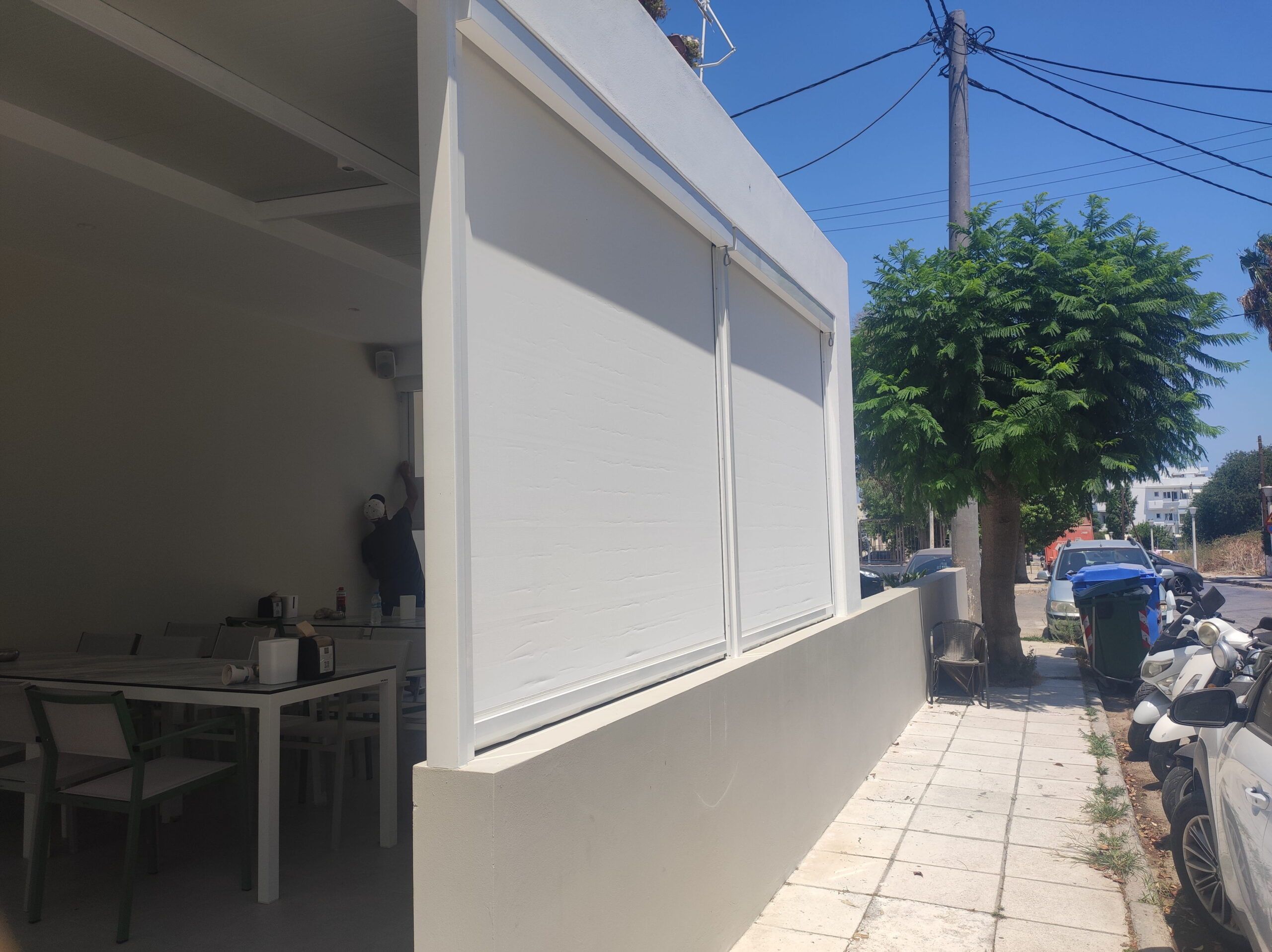 Η λύση αυτή συνδυάζει πρακτικότητα με σύγχρονη αισθητική, προστατεύοντας τον εσωτερικό χώρο από την έντονη ηλιακή ακτινοβολία και βελτιώνοντας την άνεση πελατών και προσωπικού, χωρίς να κλείνει οπτικά το κατάστημα προς τον δρόμο.
